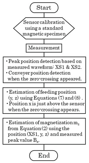Position detection using a magnetic field was reported using a combination of excitation coil and sensing marker coils or a magnet and 3-dimensional magnetic sensors. The excitation coil or magnet generates a magnetic field in the measurement area, and the sensing apparatus detects the 3-dimensional field and estimates the position of the marker or magnet [13,14]. They use a convergence calculation using an iteration method. Position detection suitable for a manufacturing system using a feeding conveyer has not been studied yet. In this study, a method of estimating position and size of a magnetic contaminant, suitable for the structure of our previously reported system, is proposed and experimentally verified.