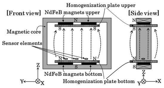 Figure 10 shows a schematic of the experimental apparatus of this study. This measurement apparatus was described in another article previously published [12]. In this apparatus, magnets are fixed on the inner surface of a rectangular magnetic core to generate a strong vertical field in the measurement area. Soft magnetic plates are put on both the upper and the lower magnets to make the field uniform. They are called homogenization plates. Sensors are set on the surface of the lower homogenization plate, near the middle position of the plate on the feeding direction X.
