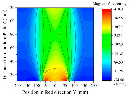 Figure 11 shows a side view of magnetic field distribution, a contour line expression of the vertical magnetic flux density Bz. The homogenization plates can produce a uniform field, but a certain degree of expansion would appear around the middle area of the measurement area. The vertical magnetic flux density was 37 mT at the sensor position and 24 mT in the middle of the measurement area. This apparatus can detect a soft magnetic small piece when it is fed along the X-direction in the measurement area between the homogenization plates.
