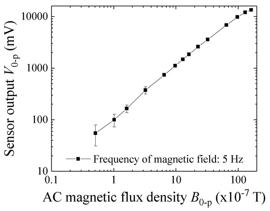Figure 12 shows the variation of the sensor output as a function of the applied magnetic flux density along the sensing direction. The sensor was driven by a 400 MHz current and detected using a logarithmic amplifier [1]. In this sensor, the output voltage of 100 mV corresponded to 0.1 μT (1 mG). The following measurements were obtained by using sensors which had the same configuration as the presented sensor system.