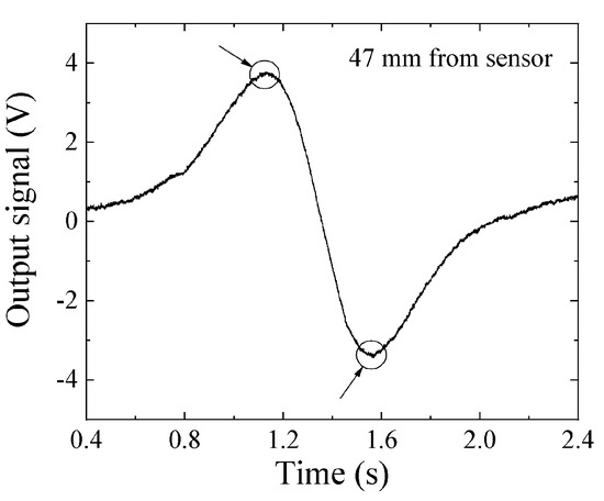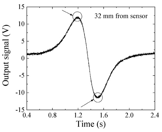 Figure 16 and Figure 17 show examples of the measured data. Figure 16 shows the case in which the feeding height was z = 32 mm, and Figure 17 that in which the feeding height was z = 47 mm. In these figures, the horizontal axis indicates time, and the sample was fed in the +X-to-−X direction, which is the reason why these figures have a opposite polarity compared with Figure 15. In comparison with Figure 16 and Figure 17, the horizontal distance of the two extreme points in Figure 17 had a larger value. This is because the horizontal distance between the two extreme points, i.e., the maximum point and the minimum point, corresponded to the feeding height of the dipole from the sensor element, which was deduced from Equation (8). The output signal 1 V corresponded to 10−6 T (10 mG) based on Figure 12, and the time of 0.1 s on the horizontal axis corresponded to 10 mm based on the feeding velocity. These are raw data; therefore the zero-crossing point was not set to be at an original point.