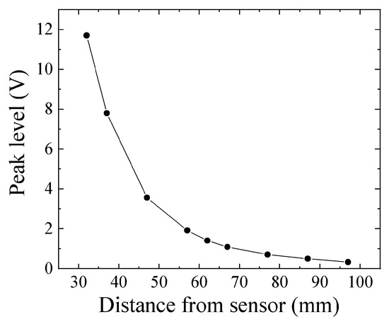 Figure 18 shows the dependence of the maximum value of sensor output voltage on the height of tool steel chipping. From Equation (2), the measured magnetic flux density decreased as the inverse of the cubic function of distance. This figure shows a tendency, as expected according to this Equation. The measured sample was ϕ5 × H4 mm (Figure 13).