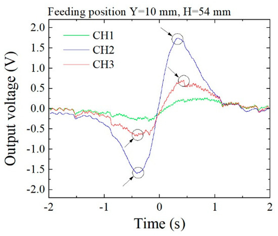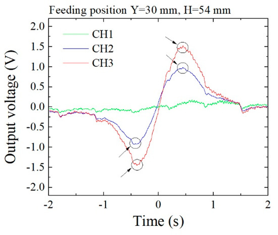 Figure 21 shows the measured waveforms of three sensors when the feeding line was at y = 10 and z = 54. Figure 22 shows the waveforms when y = 30, z = 54. Compared with these waveforms, the magnitude of the extreme points in the largest and the second larger line differed greatly, as shown in Figure 18. In this measurement, a certain degree of noise appeared, due to the detection electric circuit. The detection of the extreme point in the second larger line suffered a measurement error due to this electric noise. In this measurement, the polarity of the sensor driving circuit was set as negative.