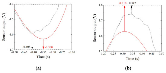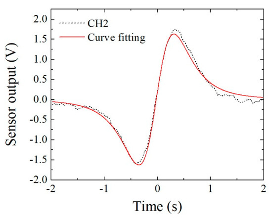 In this section, a method of curve fitting is described for the purposes of improving the accuracy and carrying out an automatic detection of the extreme position. The fundamental Equation in this case is the previously presented Equation (2). Based on this Equation, a method of extracting feature quantity is proposed, and curve fitting against the measured sensor waveform is tried and discussed.