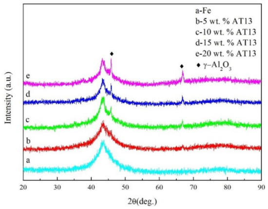 The XRD spectra of amorphous composite coatings are shown in Figure 1. It can be seen that a broad diffraction bump appeared at the angle of 2θ = 43°~45° of all coatings. Moreover, the crystal peak corresponding to the γ-Al2O3 phase also appeared in the spectrum of the composite coatings, and the intensity of the diffraction peak increased with the increase of the added content.