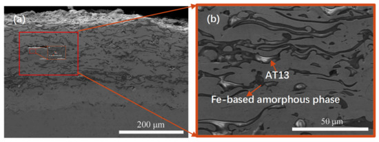 The cross-section morphologies of the Fe-based amorphous coating with 10 AT13 wt.% are shown in Figure 2. It was found that the as-sprayed coating is closely bonded to the substrate without obvious cracks. The additions are homogenous, as shown in Figure 2b, which is a magnified image of the region marked in Figure 2a, and have a dense structure with a thickness of about 250 μm. In addition, the porosity of the coating is about 1.51%. According to our previous study [11], it is indicated that the silver-grey phase in the coating is alumina phase, and the grey-black flat-shaped phase is mainly Fe-based amorphous phase, as marked in Figure 2b.