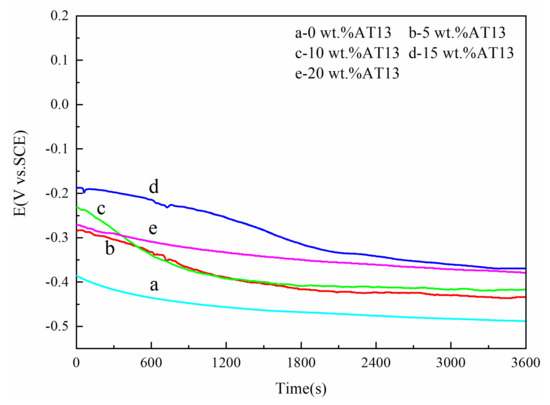 To investigate the corrosion resistance of Fe-based amorphous composite coatings in 3.5 wt.% NaCl solutions, immersion test method was chosen. Figure 3 shows the relationship between the open circuit potential of different samples against time immersed in a 3.5 wt.% NaCl solution for 3600 s. All the curves of five kinds of coatings showed two stages: there is a gradual OPC decrease as time goes on, followed by a slow OPC change thereafter. With the increase of AT13 content, the potential of coatings gradually increased. When the additive content was 20 wt.%, the OPC was slightly lower than 15 wt.% AT13. The reason is related to the porosity of the coating. The corrosive medium penetrated into the coating through the pore and the activation corrosion process continued.
