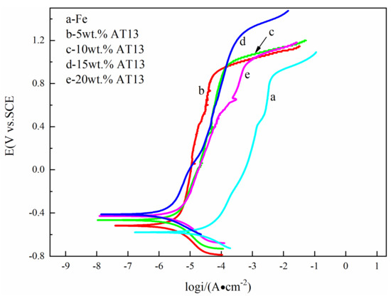Figure 4 displays the potendiodynamic polarization curves of different samples in 3.5 wt.% NaCl solutions. Table 1 shows some electrochemical parameters, such as corrosion potential (Ecor), corrosion current density (icor), passive current density (ipass), and transpassive potential (Etr). The results indicate high corrosion resistance of Fe-based composite coatings with an obvious activation zone, transition zone, passivation and over-passivation zone. Due to the amorphous structure of the Fe-based coating, the distribution of elements is homogeneous. Meanwhile, the weight ratios of Mo and Cr in the Fe-based amorphous coating are 27.22% and 21.69%, respectively. The Mo element improves the formation of the passive film Cr2O3. In 3.5 wt.% NaCl solution, the amorphous coating and composite coatings presented excellent corrosion resistance, and the self-corrosion potential was from −580 to −411 mV. Corrosion current density was in the order of 10−5~10−6 Acm2. Moreover, with the addition of the AT13 ceramic phase, the self-corrosion potential of the composite coatings was positively shifted compared with the pure Fe-based coating, and the passive current density was sharply reduced. It shows that the corrosion resistance of the composite coating with AT13 ceramic phase improved. Moreover, it is worth noting that the breakdown potential was over 1 V versus SCE, implying that the oxygen evolution appeared.