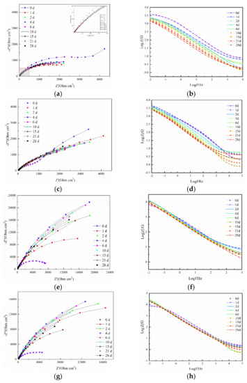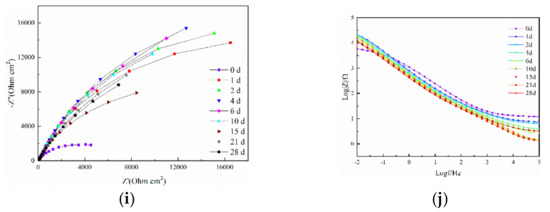 Figure 6 illustrates the EIS plots of different coatings completely immersed in 3.5 wt.% NaCl solution for 28 days. The Nyquist plots recorded at different periods of immersion time of the coatings are shown in Figure 6a,c,e,g,i and Figure 6b,d,f,h,j are the corresponding plots of Bode curves. There exist two stages of the corrosion process of coatings: 0 and 1–28 days. The data recorded at the initial stage of corrosion exhibit two time constants due to the relatively high porosity of the coating. At the initial stage of immersion, Cl− ions present in the solution penetrated into the coating from cracks and holes [12]. At the same time, the chrome oxide was formed, and it improved the corrosion resistance of the coating.
