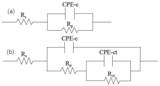 The fitted equivalent circuits: (a) initial stage corrosion of 15 wt.% and 20 wt.% AT13 composite coatings, and (b) Fe-based coating, 5 wt.%, 10 wt.% AT13 composite coatings and later stage corrosion of 15 wt.% and 20 wt.% AT13 composite coatings.