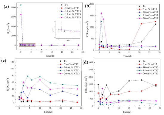 For a single coating, the impedance value was reduced from 1705 to 731 Ω·cm2, and the impedance value of the 5 wt.% AT13 composite coating was reduced from 2587 to 2160 Ω·cm2. It is difficult to distinguish the two time constants since the capacitance arcs of the low frequency are not clear [13]. One time constant was in the high-frequency range related to the capacitance impedance of the coating. The other constant was in the low-frequency range related to charge transfer resistance and a double-layer capacitance between the solution/coating interface. As the immersion time increased, the value of the resistance changed within a small range. During the 0-day immersion, the Bode plots (Figure 6b,d) presented a maximum. With the immersion increasing, the high-frequency phase angle shifted to the left and the curve dropped, indicating that more and more defects would be formed in the coating due to corrosion. In Figure 6e, the Nyquist impedance plots of the 10 wt.% AT13 composite coating showed two continuous semi-circle shapes. With the immersion increasing, the radius of the capacitance arc increased gradually, suggesting that the porosity of the coating was further reduced and the resistance of the passivation membrane to the electrolyte was enhanced. With the immersion time to day 10, the resistance value decreased gradually and then fluctuated within a small range. The EIS plots of 15 wt.% and 20 wt.% AT13 composite coatings in 3.5 wt.% NaCl solution for the 28 days are shown in Figure 6g–j. There existed two stages of the corrosion progress for the coatings: 0 days and after 1 day. At day 0, a single capacitance resistance arc occurred in Nyquist impedance plots (shown in Figure 6g,i). It can be seen that the complete shielding layer existed in the composite coating, which effectively prevented the corrosion. The resistance value of the 15 wt.% AT13 composite coating was 2780 Ω·cm2 at the same time. Compared to the 20 wt.% AT13 composite coating, the radius of the semi-circle arc was bigger, indicating that the corrosion resistance of the 15 wt.% AT13 composite coating was better. After 1 day of immersion, the Bode impedance plots showed two time constants, indicating that the solution had reached the oxide layer interface and the micro-galvanic reaction. From the EIS plots of the pure amorphous coating and the composite coating, we can learn that the radius of the capacitance resistance arc was the biggest when the addition of AT13 was 15 wt.%, which suggested that the corrosion resistance was improved.