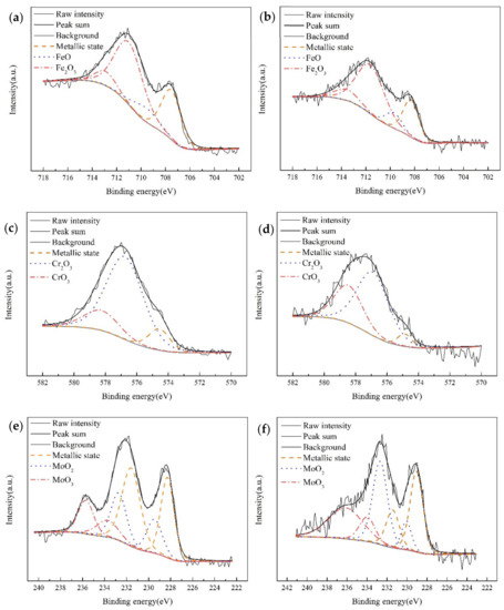 In order to further analyze the corrosion mechanism of different coatings, the Fe-based amorphous coating and 15 wt.% AT13 composite coating were investigated by XPS. Figure 9 presents the XPS fine spectrum of Fe2p, Cr2p and Mo3d in the surface passivation. As shown in Figure 9a,b, the Fe2p3/2 spectrum consists of four overlapped peaks at 707 and 709~714 eV, which matches the Fe2+ and Fe3+ oxidation states [13]. In Figure 9c,d, the Cr2p3/2 spectrum can be resolved into three peaks at 574, 576 and 578 eV. The peaks at 574, 576 and 578 eV represent the Cr0 metallic state, Cr3+ oxidation state and Cr6+ oxidation state, respectively [15]. Moreover, the Co0 metallic state is a part of the Cr2p3/2 spectrum. The fitting results of the Mo3d spectrum are shown in Figure 9e,f. Meanwhile, two peaks at 228~229 and 230~231 eV were attributed to the Mo0 metallic state. The peaks at 229~230 and 232~233 eV could be associated with the Mo3+ oxidation state. The peaks at 233~234 and 234~236 eV were attributed to the Mo4+ oxidation state.