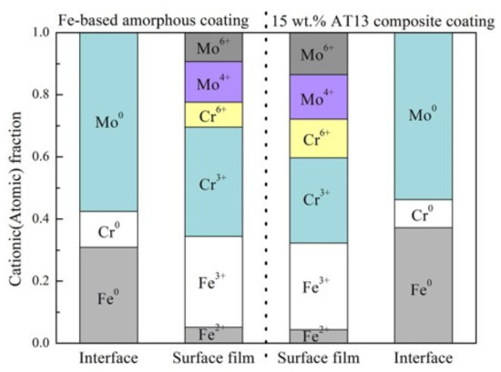 The quantitative analysis of XPS results can help to easily understand the corrosion resistance mechanism of the coatings. We suppose that the metal ions in the oxidation state are derived from the composition of the passivation film, and the metal ions correspond to the passivation film/coating metal interface. The relative composition of passivation film and the interface can be determined. Figure 10 shows the cationic component in the passivation film and the atomic component at the coating interface. For comparison, the passivation film of the pure coating exhibited a higher Fe oxide content and a lower Mo oxide content than the composite coating. In addition, the Mo3d spectrum of the composite coating surface was mainly the Mo4+ oxide state. It was reported [16] that Mo4+ oxide in the passivation film can greatly improve the stability of the passivation film, thereby further enhancing the local corrosion resistance. In this study, the corrosion resistance of the composite coating was better than that of the single coating. This result is consistent with the EIS data mentioned above.