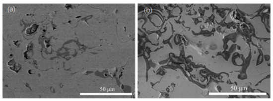 To clarify the mechanism of corrosion for the coatings, the surface corrosion morphologies of the pure Fe-based coating and that of the 15 wt.% AT13 composite coating after immersion for 28 days were investigated by SEM. As shown in Figure 11, the corrosion of the coating surface was uneven. In addition, the corrosion preferentially occurred at the edge of the pore defect and the oxide [17]. Nevertheless, the corrosion of the composite coating was less serious. This is because many pores and micro-cracks occurred in the single coating, and the Cr-rich and Cr-poor regions at the oxide edge formed the micro-galvanic corrosion, which will become a preferential corrosion region, leading to the ion penetration and corrosion reaction. As the corrosion time extended, the coating peeled off and formed obvious pits. This indicates that the corrosion resistance of the coating was further deteriorated, but a large amount of corrosion products have not yet accumulated.