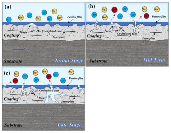 The long-term corrosion mechanism diagram of the composite coating is illustrated in Figure 12. As shown in Figure 12a, there are some pore defects on the surface of the sample. Meanwhile, there are mainly some interlayer gaps composed of oxide. Due to the flying oxidation of particles during plasma spraying, Cr-depleted areas are formed around the pores [18]. However, when the coating was fully immersed, the pores on the surface were filled with NaCl solution. After that, the Cr-depleted area around the pores quickly dissolved (shown in Figure 12b), thus showing a typical crevice corrosion reaction at the micro-defects of the pores. At this time, the surrounding area will be further dissolved because of the location advantage of the extreme occlusion in the hole and the harsh corrosion environment. As the immersion time increased, the corrosion area of the pores increased and the depth of the corrosion also increased. It gradually connected with the internal closed pores and the intermediate layer, becoming a channel for corrosion ions to invade the coating/substance interface (Figure 12c). In general, with the increase of AT13 content, the pore micro-defects and pore size in the composite coating reduced. It resulted that the probability and rate of the crevice corrosion reduced, and the polarization test also showed lower corrosion current density and higher self-corrosion potential.