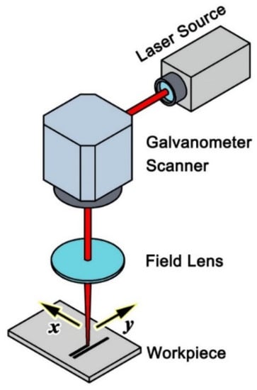 In this study, the micro-dimpled texture was produced using a commercial laser marking system. The schematic diagram of the system is shown in Figure 1, and the specifications are listed in Table 1. A laser beam passed through a galvanometer scanner and a field lens and then irradiated the workpiece surface directly. The scanner could quickly adjust the position of the laser beam using a two-axis mirror galvanometer system. The laser beam had a nearly Gaussian profile (>95%).