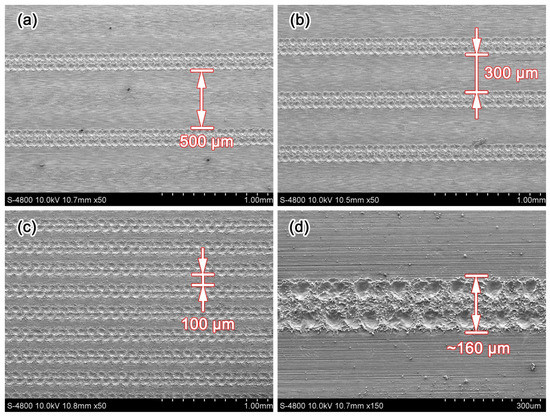 The textured surfaces were observed using scanning electron microscopy (SEM), as shown in Figure 2. The micro dimples were arranged tightly in rows rather than in a uniform distribution across the workpiece surface, and two rows of micro dimples formed a textured belt. Three different textures were prepared, each with a different distance between the textured belt: 500 μm, 300 μm, and 100 μm, and the dimple density for each were (a) 25.3% low density, (b) 36.2% medium density, and (c) 63.0% high density, respectively.