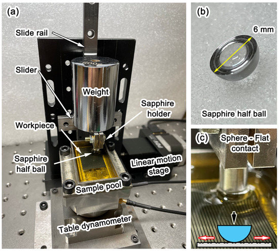 The effect of the micro-dimpled texture in tribological contacts has been evaluated using reciprocating sliding tests under both dry and lubricated conditions. The tests were performed using a homemade reciprocating friction tester. The experimental setup is shown in Figure 3. The workpiece was mounted on a three-component quartz table dynamometer. The force signals were collected by a data-acquisition system and recorded in a computer with a sampling rate of 1024 Hz. The sliding motion was driven by a CNC linear motion stage. Sapphire (Al2O3) was selected as the other material in the friction pair, and a 6 mm-diameter sapphire half ball was mounted on the tester. The properties of sapphire are shown in Table 2. For the lubricated tests, SAE 0W30 engine oil was selected as the lubricant. The initial lubricant temperature was room temperature (20 °C), and 20 cm3 of engine oil was added to the sample pool (as shown in Figure 3c) before each test. The workpiece was immersed in the engine oil.