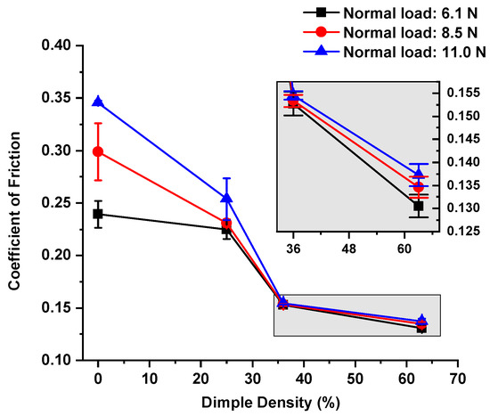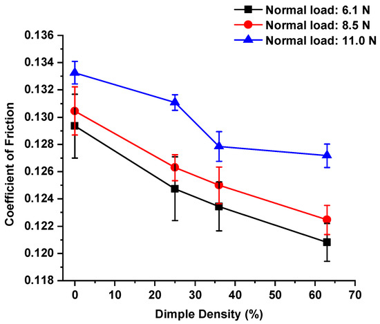 Under dry conditions (Figure 4), the micro-dimpled texture significantly reduced the CoF compared to that observed in the non-textured case, especially for a normal load of 11.0 N. The maximum friction reduction for normal loads of 6.1 N, 8.5 N and 11.0 N was 45.5%, 54.9%, and 60.3%, respectively. For medium (36.2%) and high (63.0%) densities, the CoF error bars corresponded to the overlap of different normal loads. Thus, the differences in the average CoF obtained from varying normal loads were minimized when higher dimple density was applied.