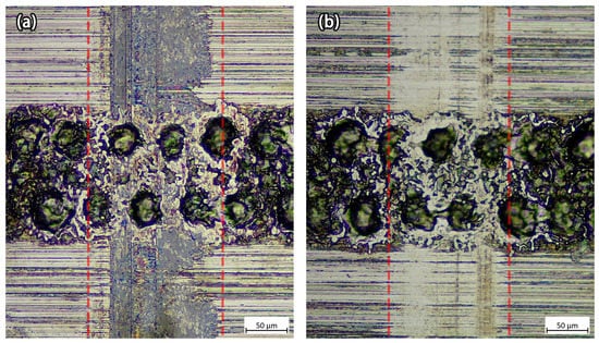 The textured workpiece after the sliding tests for both (a) dry and (b) lubricated conditions (normal load: 11.0 N; dimple density: 63%; magnification: 20×).