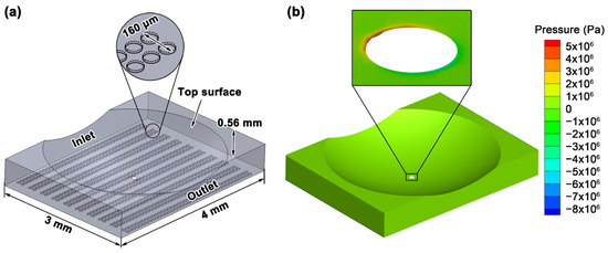 A computational fluid dynamics (CFD) model was designed based on the experimental setup to check the hydrodynamic pressure generation. A small flow area was chosen from the experimental setup. The flow area was 3 mm by 4 mm, as shown in Figure 7. The film thickness was set at 10 μm. The texture distribution in the model followed the experimental workpiece. The texture unit was designed based on a real dimple, which was fabricated on the workpiece, that had a diameter of 70 μm and depth of 8 μm. The width of the texture belt was 160 μm. Figure 7a shows the flow domain of the CFD model, based on a high dimple density case under a normal load of 11.0 N. The hole at the center of the flow domain indicated the contact area. The diameter of the hole was set based on the Hertzian contact calculation. In Figure 7a, the inlet and outlet indicate the fluid inflow boundary and outflow boundary of the CFD model, respectively. The inlet and outlet were defined as pressure-based; the operating pressure was set to 101,325 Pa. The bottom wall and two side walls were stationary; the translational motion was set so that the top sphere surface mimicked the relative motion of the friction pair, and the translational motion was set to 0.01 m/s. Based on the Hertz contact analysis, we assumed no coherent lubricant film was in the contact area. Thus, the contact area was excluded from the flow domain model.