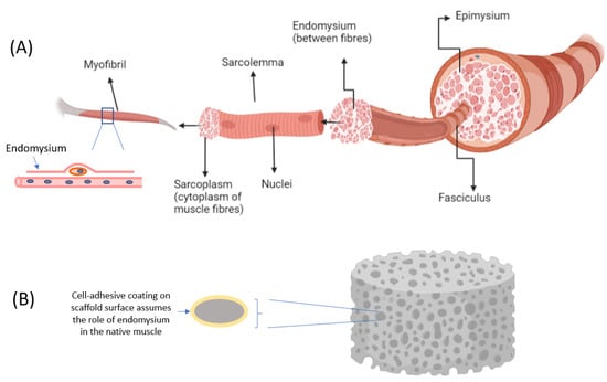 The role of the scaffold (B) in guiding muscle cell differentiation and muscle fiber development is analogous to that of muscle connective tissue layers (A). The extracellular matrix of the endomysium plays an important signaling role in the regeneration of muscle fibers (adhesion, differentiation, proliferation, and inhibitory cues). In scaffolds the role of regulating muscle maturation is assumed by the coatings or surface modifications of the scaffold. Collectively, the endomysium, perimysium, and epimysium define the different levels of muscle organization and structure, a role which is also assumed by tissue scaffolds.