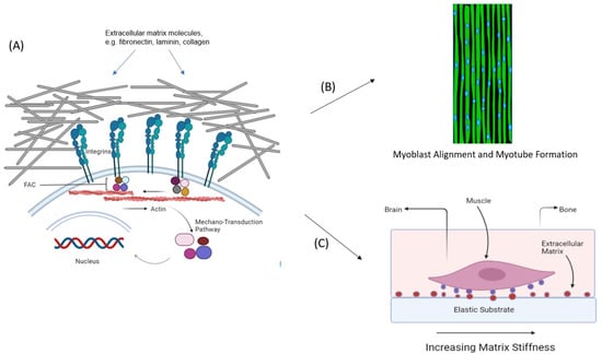 The binding of integrin receptors and cell recognition motifs will induce the downstream mechanotransduction signaling pathway and, consequently, control how the cell behaves and functions (Figure 2) [,]. In essence, integrins function by transmitting information from the ECM to the actomyosin cytoskeleton in the cell through the focal adhesion complexes []. The amplitude of the forces generated depends on the mechanical properties of the ECM, one important parameter of which is matrix stiffness. Skeletal muscle tissue has an intermediate range of matrix stiffness, with a Young’s modulus value of approximately 10 kPa, while hard bone tissue has a higher Young’s modulus value of approximately 30 to 45 kPa []. If the Young’s modulus is not within the range of the specific tissue, the cells will not be able to take on cues from their ECM. In the same vein, matrices should be engineered with the appropriate Young’s modulus value, thus controlling the fate of stem cells when recreating specific tissue. In a landmark study, Engler et al. showed that mesenchymal stem cells differentiate into specific lineages in accordance with the stiffness of the substrate upon which the cells are cultured []. Mesenchymal stem cells cultured on polyacrylamide substrates with Young’s moduli ranging between 8–17 kPa were shown to differentiate into a skeletal muscle phenotype, which agrees well with the stiffness of the native muscle microenvironment (Figure 2). Such an effect is also observed for cells cultured in 3D matrices []. Interestingly, by sensing the stiffness of the surrounding matrix stem cells can contextually reorganize the ECM to create a local niche. This mechanosensing mechanism involving forces from the cytoskeleton to the adhesive bond is influenced by the ECM composition as well as by the expression of particular subsets of integrin heterodimers [].
