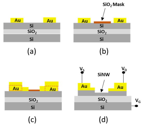Figure 1 shows a scheme of the main steps to generate a SiNW field-effect transistor. First, gold microelectrodes were patterned by photolithography on a silicon-on-insulator sample (Figure 1a); o-SPL was applied to define a narrow and ultrathin silicon oxide mask (Figure 1b). A second photolithography step was applied to deposit a thin Au film and to close the gap between the microelectrodes and the o-SPL mask (Figure 1c). The next step involved the etching of the unmasked silicon region by reactive ion etching. Finally, the three electrodes of the back-gated device were connected to power sources (Figure 1d).