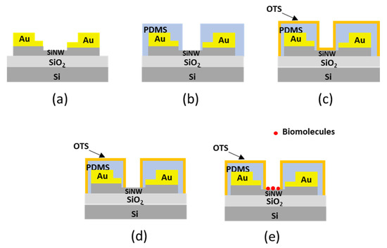 Steps to develop a SiNW biosensor. (a) SiNW FET. (b) PDMS deposition to protect the Au electrodes from the buffer solution. (c) Coating the device with an OTS layer. (d) Removal of the OTS from the surface of the SiNW by the AFM tip. (e) Adsorption and detection of biomolecules.