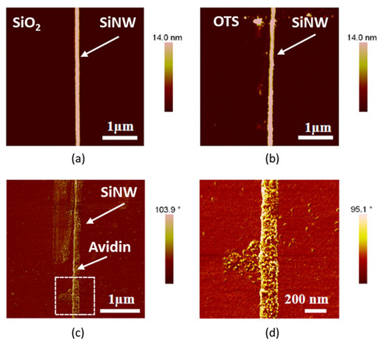 Amplitude modulation AFM images of the surface of a SiNW were acquired before (Figure 3a) and after OTS functionalization and removal (Figure 3b). AFM phase images [33] obtained after the deposition of avidin revealed that the proteins were deposited on or near the SiNW surface (Figure 3c,d). From Figure 3d we were able to count the number of avidins over the nanowire. On average, one avidin molecule was found every 5 nm along the SiNW. An avidin molecule occupied approximately 30 nm2. In total, we estimated 10,000 molecules over the SiNW shown in Figure 3c.
