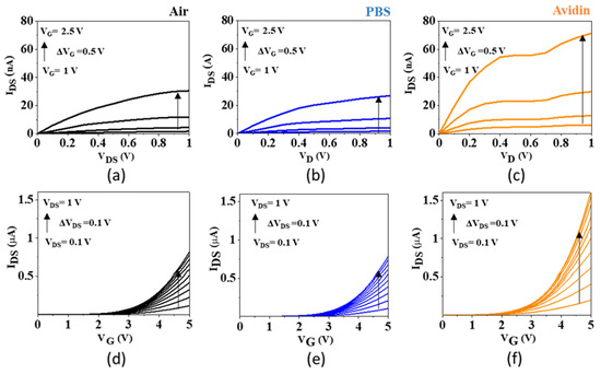 Figure 4a,b showed the output curves of a SiNW FET in air and after its immersion in PBS (control measurements). The curves were very similar in both environments. This experiment showed the stability of the device in a liquid environment. Figure 4c showed the response of the same SiNW after a drop of a liquid containing avidin molecules was drop-casted. A significant increase of the current was observed (Figure 4c) with respect to the curves obtained in air or PBS. The increase of the current was consistent with the positive charge carried by avidin (the pH of the buffer was 7.4 while the isoelectric point of avidin was about 10). The corresponding transfer curves are shown in Figure 4d–f.