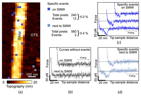 Figure 5a shows the topography maps obtained from the SMFS force volume image. The image shows the SiNW in the center, surrounded by the OTS-covered substrate. Each pixel corresponds to an individual force-distance curve. While most of the retraction curves were featureless (Figure 5b), some curves exhibited a specific unbinding event. The positions of these curves are marked in blue. Light and dark blue corresponds to the OTS-covered substrate and the SiNW, respectively. Some example curves with specific unbinding events are shown in Figure 5c,d.