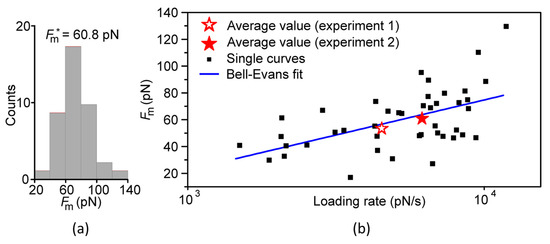 In order to verify the specificity of the observed unbinding events we applied the Bell–Evans model [42,43]. Figure 6a shows the overall distribution of force values. The average measured force, Fm* = 60.8 pN, agreed well with reported data obtained with cantilevers of similar stiffness [34,40].