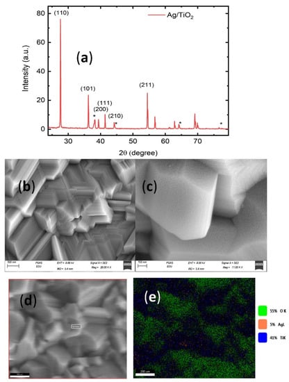 (a) XRD of Ag/TiO2 nanocrystals, * represents the XRD peaks of silver. (b,c) Top-view SEM of Ag/TiO2 nanocrystals with two different magnifications 20,000× and 77,000×. (d,e) EDX mapping of Ag/TiO2 (55% O, 5% Ag, and 41% Ti).