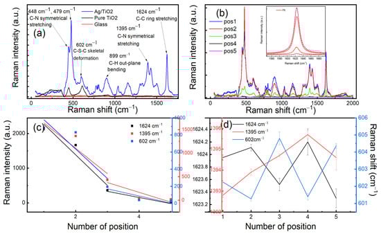 Figure 2a shows SERS spectra on the different samples: Ag/TiO2, pure TiO2, and glass. First, we tested MB on glass substrate to exclude the far-field response as an origin of the SERS signal. We can clearly see that there is no SERS signal observed into the glass. In order to assure that the silver nanoparticles are of the origin of SERS generated by MB, we performed different scans into the surface of pure TiO2 and Ag/TiO2. Consequently, we observed the effect of silver nanoparticles on the enhancement of Raman spectra of MB; however, for the pure TiO2, we just observed the phonon modes of the rutile phase located at 447 cm−1 and 610 cm−1. SERS spectra of MB into Ag/TiO2 show the appearance of the vibrational modes of MB located at 448 cm−1 (C-N symmetrical stretching), 479 cm−1 (C-N symmetrical stretching), 602 cm−1 (C-S-C skeletal deformation), 899 cm−1 (C-H out plane bending), 1395 cm−1 (C-N symmetrical stretching), and 1624 cm−1 (C-C ring stretching) [,]. Figure 2b shows the SERS spectra of MB on different positions of Ag/TiO2. It is observed the intensity changes between the position, this is related to the inhomogeneity distribution of hot spots (HS) intensity into the surface. In order to study the effect of the enhancement on the Raman lines of MB, we extracted the Raman shift and Raman intensity of different bands such as 602 cm−1, 1395 cm−1, and 1624 cm−1. Figure 2c shows that the intensity of the three bands decrease linearly with the same slopes for the different positions. Two regions are observed with two different slopes, the first one is between pos1 and pos3 and the second one between pos3 and pos5. In order to check the reproducibility of the spatial enhancement, we carried out two mappings (10 μm × 10 μm) of the SERS intensity for the two bands 480 cm−1 and 1623 cm−1. The two mappings are the plot of an integrated intensity under each peak (see Figure S1).