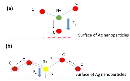 The Raman shift variation has different features than those of the intensities. The three bands in Figure 2d present the different features. The C-N symmetrical stretching mode shifts linearly toward the blue by decreasing the intensity; this indicates a compressive stress the molecules undergo when excited by the local electrical field. The latter can be explained by two springs placed at the terminus of the MB molecule where an electrical force exists between the cations (terminus of the molecule) and the silver nanoparticles that play the role of anions (see Figure 3a). When the local electric field decreases, the electric force decreases and hence the spring retracts. The latter could explain the observed blue shift. For C-S-C skeletal deformation and C-C ring stretching modes, they are varied opposite to each to other; if one shifts to the blue energy, the second shifts to the red energy. This can be explained by the fact that if the sulfur atom is pulled by a physical force originating from the silver particles (Figure 3b), the C-S-C bond will be compressed and consequently the C-C bond will be stretched, and the reverse is true. As the skeletal modes are not symmetric, this can explain the oscillation behavior as a function of the position. The latter confirms that the two modes depend on the polarization of the local electric field where its gradient changes when the molecules move far from the hotspots and not the magnitude.