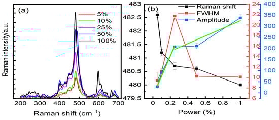 Power-dependent SERS study. (a) Power percentage varies between 5% and 100%. (b) Parameters (FWHM, Raman shift, amplitude) extracted from the fitting of the band located at 480 cm−1 with a Lorentzian function. Linear functions (two green lines) used to fit the variation in the amplitude.