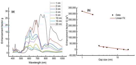 (a) Variation in the enhancement factor g as function of the wavelength for different gap size. (b) Variation in the enhancement factor g4 as function of the gap size between the silver nanoparticles. The red line represents a linear fit to the data. The slope is −91,934 for the gap size range [1–2 nm] and −39,013 for [3–20 nm]. Adj. R-square 0.89518.