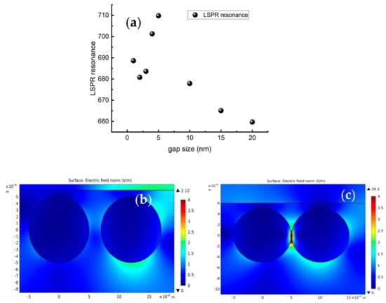 Figure 6a presents the variation in LSPR versus the gap size. We observe a red shift with a fast slope by varying the gap between 2 and 5 nm, then a blue shift with slower slope between 10 and 20 nm. For a LSPR wavelength located at 633 nm that corresponds to the excitation wavelength used in our experimental conditions, we presented a mapping of the optical enhancement for two different gap sizes, 1 nm and 20 nm (see Figure 6b,c). The mapping is performed on 20 × 20 nm of two silver nanoparticles with a diameter 10 nm deposited onto TiO2. The enhancement factor g is intensively localized within the gap size of 2 nm; however, it is negligible within the gap size of 20 nm.