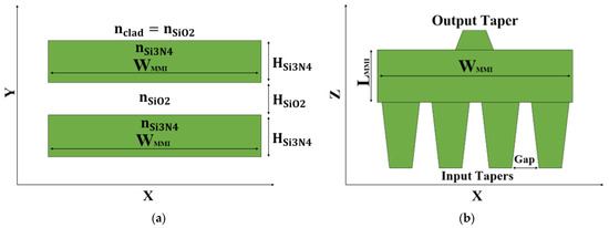 Illustration of the 4 × 1 MMI coupler intensity combiner: (a) XY cross-section view. (b) XZ cross-section view.