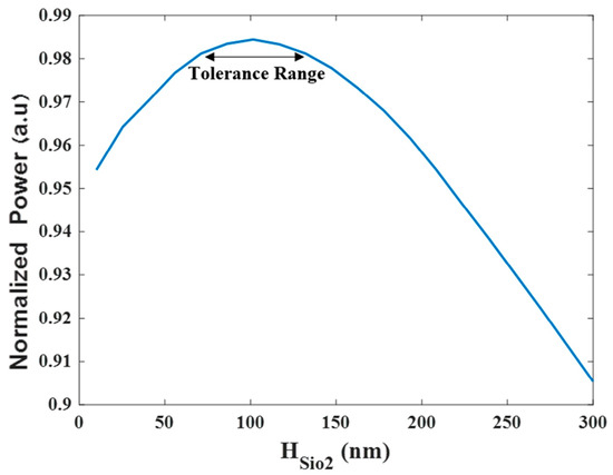The simulations of the 4 × 1 MMI power combiner based on Si3N4 slot waveguide were performed using Rsoft-cad software. The graphs were plotted using Matlab script codes based on the collected data from the FV-BPM results. The thick layer of both the Si3N4 and SiO2 were set to 350 nm and 100 nm, respectively. The thickness of the SiO2 layer was optimized according to the slot waveguide physical behavior of the TE fundamental mode field. The normalized power level of the TE fundamental mode was simulated and solved for finding the optimal slot thickness size as shown in Figure 2. From this figure, the optimal value of the SiO2 layer can be found and is 100 nm. To satisfy the limit error fabrication that can happen today in a good fab that works with high precision, at least a ±20 nm range was set to be the tolerance range [34]. Therefore, the tolerance range was set between 80–120 nm which is suitable for 98% of the normalized power as shown in Figure 2. The thickness of the Si3N4 layer was set to be 350 nm to match the standard ability that exists today in a fab facility to fabricate an Si3N4 layer which is usually between 300–400 nm.