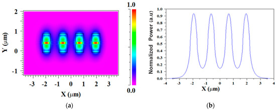 Figure 4a shows the TM fundamental mode field profile for the four coherent sources for the operation wavelength of 1310 nm at the x-y plane. It can be observed that the light is strongly confined inside the SiO2 layer area (red color) as shown in Figure 4a. The normalized light power level for each TM fundamental mode over the x-axis at the center of the SiO2 layer can be seen in Figure 4b. Considering the results of the simulations shown in Figure 3 and Figure 4, the TM mode has a less normalized power level compared to the TE mode. Furthermore, the TE mode has better flexibility to laser alignment precision over the y-axis with an 800 nm range. Thus, the combiner was chosen to function under the TE mode.