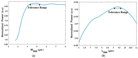 Figure 5a shows the tolerance range of the width of the MMI coupler, and Figure 5b shows the tolerance range of the length of the MMI coupler. As we can see, the tolerance range is 4.2–5.5 μm (under 97% of the normalized power) and 8.65–9.75 μm (under 98% of the normalized power), respectively. These tolerance values have over 0.45 μm flexibility which is considered good for the fabrication process of the MMI coupler [17].
