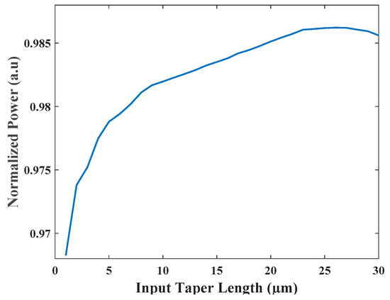 The input waveguide taper locations were optimized to avoid light coupling between closer laser sources and using FV-BPM simulations. The optimal Gap was found and its value is 0.75 μm. The length of the input taper is 17 μm with a width that varies between 0.5 to 0.9 μm, and the length of the output taper is 2.5 μm with a width that varies between 1 to 0.5 μm. To satisfy the adiabatic condition of the waveguide taper, it is required to conduct optimizations on the input taper length as shown in Figure 6. From this figure, it is clear that the optimal value is 22 μm which fulfills the adiabatic condition. It is also compact.