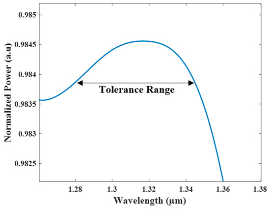 Figure 8 shows the normalized power of the combiner over the O-band spectrum (1.26–1.36 µm), and from this figure, it can be seen that the combiner has a high efficiency of 98.2–98.45% over the O-band spectrum. As can be seen from Figure 8, the combiner was designed to have maximum power at 1310 nm and good stability to the wavelength drift over the O-band range with at least 98.2% of the total power.