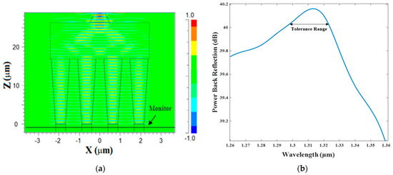 In this design, we utilize the Si3N4 slot waveguide and the inputs/output tapers for dramatically reducing the effect of the BR power. Using finite difference time domain (FDTD) simulation as shown in Figure 9a, the BR power value was found which is more than 40 dB. In this simulation, a monitor was placed under the input taper using a segmented waveguide for collecting the reflections coming back from the MMI coupler as shown in Figure 9a. It can be seen that the BR values were more than 39.1 dB over the O-band spectrum. The combiner can function with a very low BR around 40 dB for a wavelength tolerance range of 1300 to 1330nm as shown in Figure 9. In our case, the device was designed and optimized to work at the wavelength of 1310 nm. Thus, as can be observed in Figure 9b, the optimal power BR value is 40.15 dB.