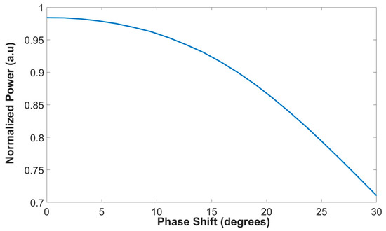Another important aspect from the particle view is that the laser sources function as a non-coherent Gaussian source. To study the penalty from this aspect, a simulation with non-coherent sources was conducted by inserting a different phase for each Gaussian source. Figure 10 shows the normalized power as a function of the overall phase shift between the four non-coherent sources. As can be seen, our proposed combiner can function well with a high combiner efficiency of 90% and above for phase shifts from 0 to 17.3 degrees. However, the penalty for higher change in the phase can reduce the power combiner level as can be seen in the case of 30 degrees with a combiner efficiency of 70.7%. To resolve this issue, a controller which controls the phase of the four input sources needs to be added to the input waveguide section, and such a device is called a thermo-optic phase-shifter. For our design, the most suitable thermo-optic phase-shifter type is titanium nitride (TiN) metal [38] which can be located above the SI3N4 slot waveguide layers, and the heating of the metal can be controlled by a driver voltage. This solution can be used to match the phase between the input sources. However, it costs more from an energy point of view because of the additional electrical power that is needed for heating the TiN metal.