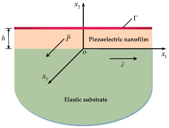 for the elastic substrate. In Equations (1)–(4), , , , and are, respectively, the elastic stiffness measured at constant electric field, the piezoelectric constant, the dielectric permittivity measured at constant strain, and the mass density of the piezoelectric nanofilm; is the shear modulus of the elastic substrate, and is the two-dimensional Laplacian operator. Throughout this paper, the overline is adopted to represent the substrate.