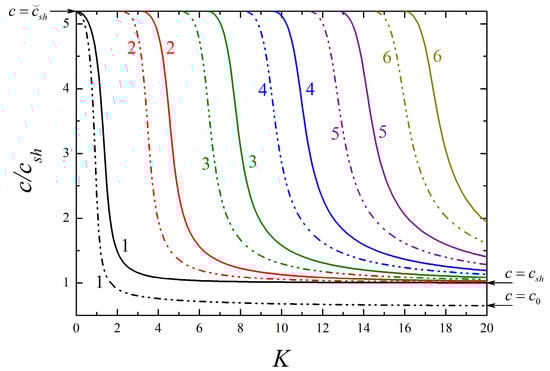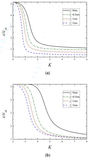 The dispersion relationships between the phase velocity and the wave number can be further determined by solving Equation (41) numerically. It is worth noting that both the residual surface stress and surface electric displacement are absent in Equation (41), which means that these two residual fields have no effect on the dispersion behaviors of SH-type surface waves. This is consistent with the theoretical results given earlier by Gurtin and Murdoch []. Specifically, when the surface effects are excluded by setting all the surface-related parameters equal to zero, Equations (20) and (21) are reduced to the conventional traction-free and electrically open-circuited boundary conditions, under which Equation (41) takes the following form since the solutions exist only if , i.e.,