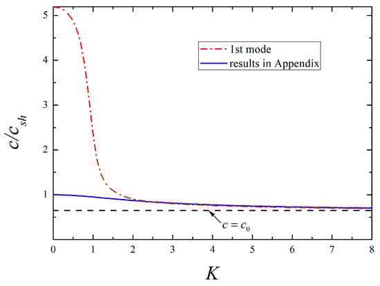Since corresponds to the limit , the dispersion curve governed by Equation (A8) must start from to as the wave number increases, as shown in Figure 3.